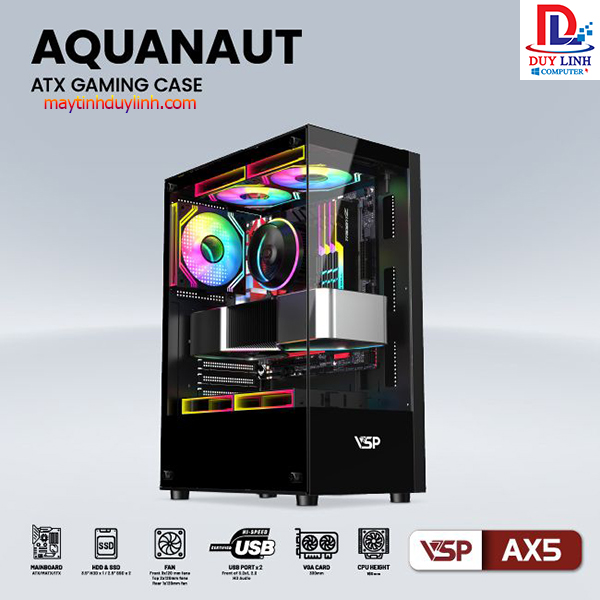 – Case VSP AX5 Aquanaut Gaming Đen là một case máy tính mid-tower, được thiết kế theo phong cách gaming với tông màu đen chủ đạo. Case này được sản xuất bởi VSP, một thương hiệu case máy tính nổi tiếng của Việt Nam.