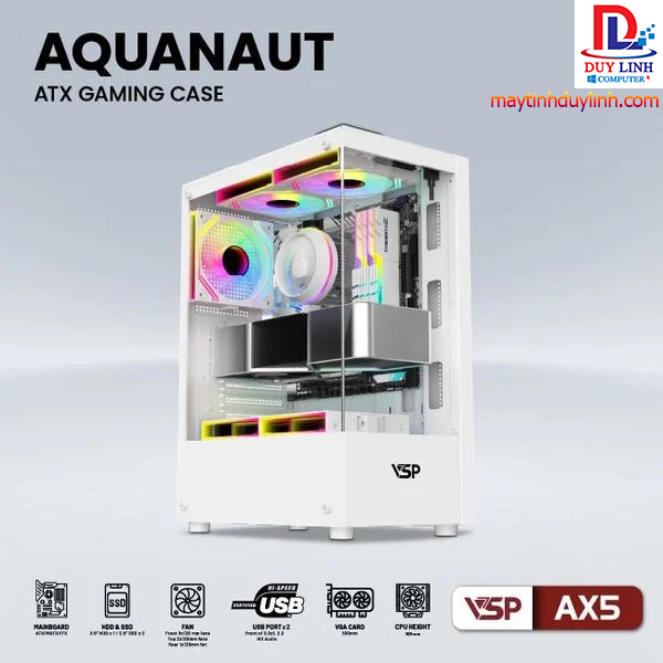 – Case VSP AX5 Aquanaut Gaming Trắng là một case máy tính mid-tower, được thiết kế theo phong cách gaming với tông màu đen chủ đạo. Case này được sản xuất bởi VSP, một thương hiệu case máy tính nổi tiếng của Việt Nam.