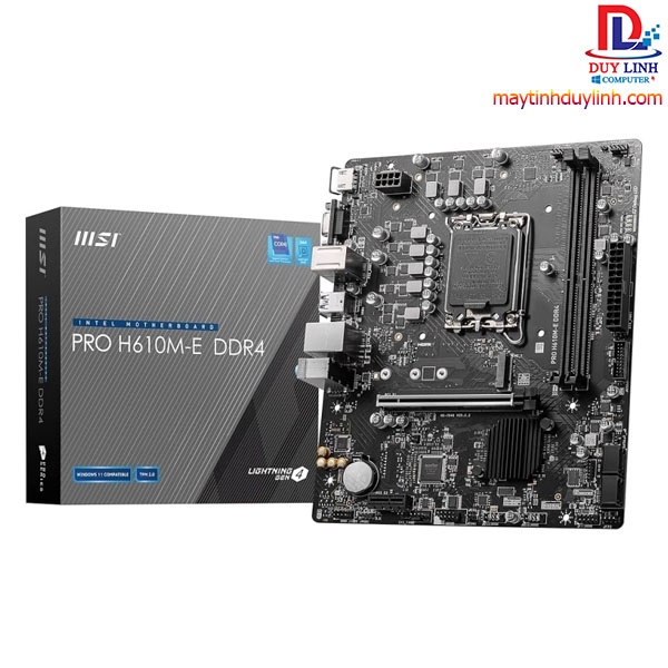 Main MSI H610M-E DDR4 là một bo mạch chủ thuộc dòng PRO Series của MSI, được thiết kế cho các hệ thống máy tính văn phòng, máy tính gia đình và máy tính chơi game giá rẻ. Bo mạch chủ này hỗ trợ bộ vi xử lý Intel® Core™, Pentium® Gold and Celeron® thế hệ thứ 12 sử dụng socket LGA 1700.