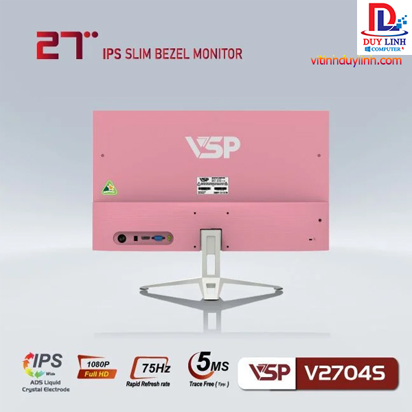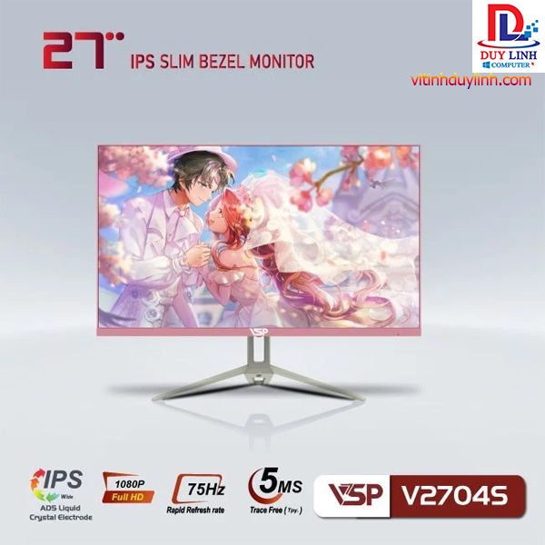 Màn hình VSP V2704S là một màn hình máy tính 27 inch với thiết kế màu hồng độc đáo, hướng đến người dùng yêu thích sự trẻ trung và năng động. Màn hình sử dụng tấm nền IPS cho chất lượng hình ảnh tốt và góc nhìn rộng, cùng tần số quét 75Hz mang lại trải nghiệm mượt mà hơn cho các tác vụ hàng ngày và giải trí.