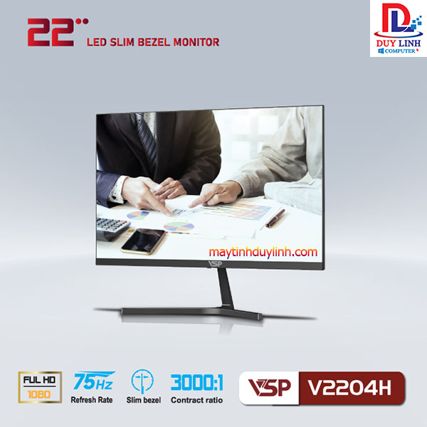 Màn hình VSP 22in V2204H VA 75Hz Đen là một sản phẩm màn hình máy tính LCD với kích thước 22 inch, độ phân giải Full HD (1920 x 1080), tần số quét 75Hz và tấm nền VA. Sản phẩm có thiết kế tràn viền hiện đại, màu sắc đen huyền bí, phù hợp với nhiều không gian sử dụng khác nhau.